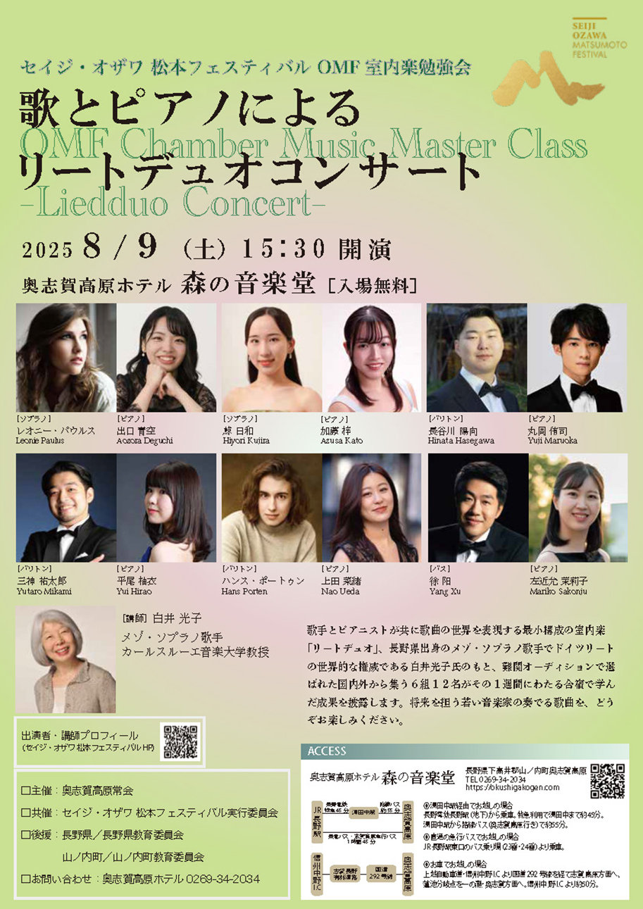 歌手とピアニストが共に歌曲の世界を表現する最小構成の室内楽「リートデュオ」、長野県出身のメゾ・ソプラノ歌手でドイツリートの世界的な権威である白井光子氏のもと、難関オーディションで選ばれた国内外から集う6組12名がその1週間にわたる合宿で学んだ成果を披露します。将来を担う若い音楽家の奏でる歌曲を、どうぞお楽しみください。