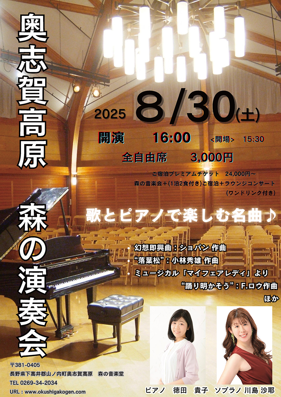 奥志賀高原は、標高1,500メートルの澄み切った空気と豊かな森に包まれた特別な地。ここ「森の音楽堂」は、雪の結晶をモチーフに設計された六角形の木造ホールで、演奏者の息遣いまでも感じ取れるほど観客との距離が近く、柔らかくも力強い音色が空間全体に美しく響きわたります。 自然との共鳴、美しい響き、そしてトップアーティストたちの熱演が融合する、ここでしか体験できない“森の祝祭”。その始まりを、ぜひご体感ください。