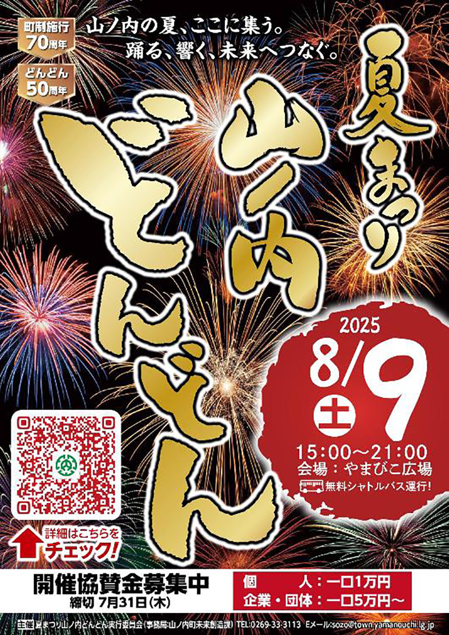 町制施行70周年、そして「山ノ内どんどん」誕生50周年という節目の夏 今年のどんどんは、これまで大切にされてきた笑顔あふれる夏まつりの伝統を継承しながら、世代を超えて人がつながる“未来志向のまつり”として開催します。 コンセプトは「山ノ内の夏、ここに集う。踊る、響く、未来へつなぐ。」 踊り・音楽・花火、そして環境への配慮を通じて、町の魅力を再発見できる一日となることを目指します。 この夏、山ノ内に住む人も、訪れる人も、一緒になって“未来へつながる一日”をつくりませんか?